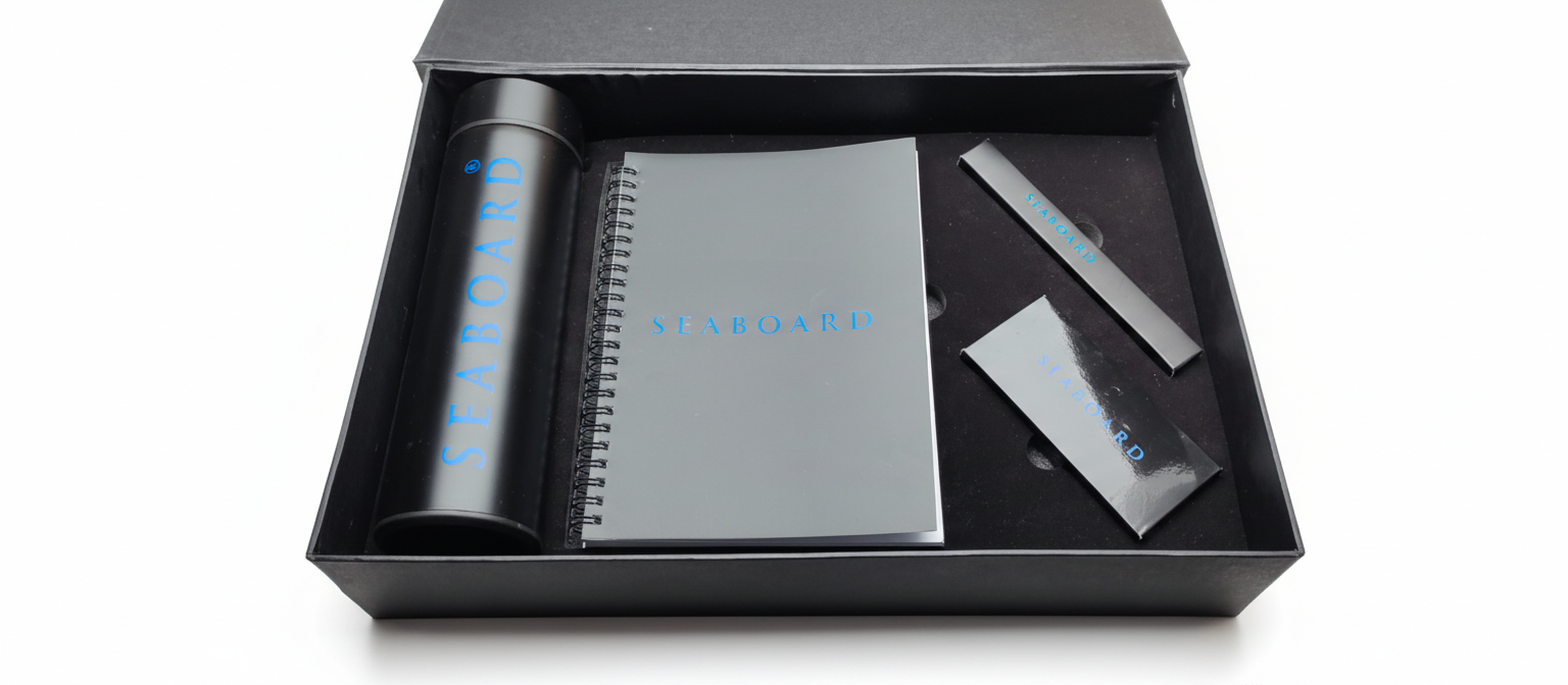 Seaboard Signature Gift Box – The set includes a Seaboard-branded insulated bottle, spiral notebook, premium pen, and metal keychain — making it the perfect corporate gift for clients, partners, executives, and special events.